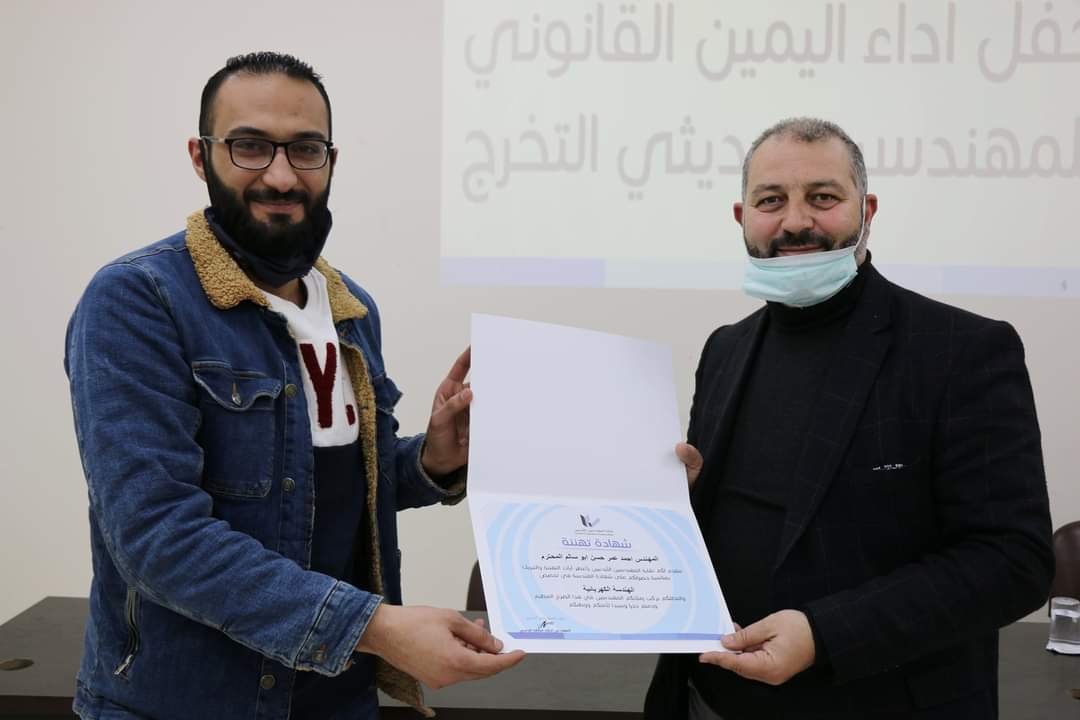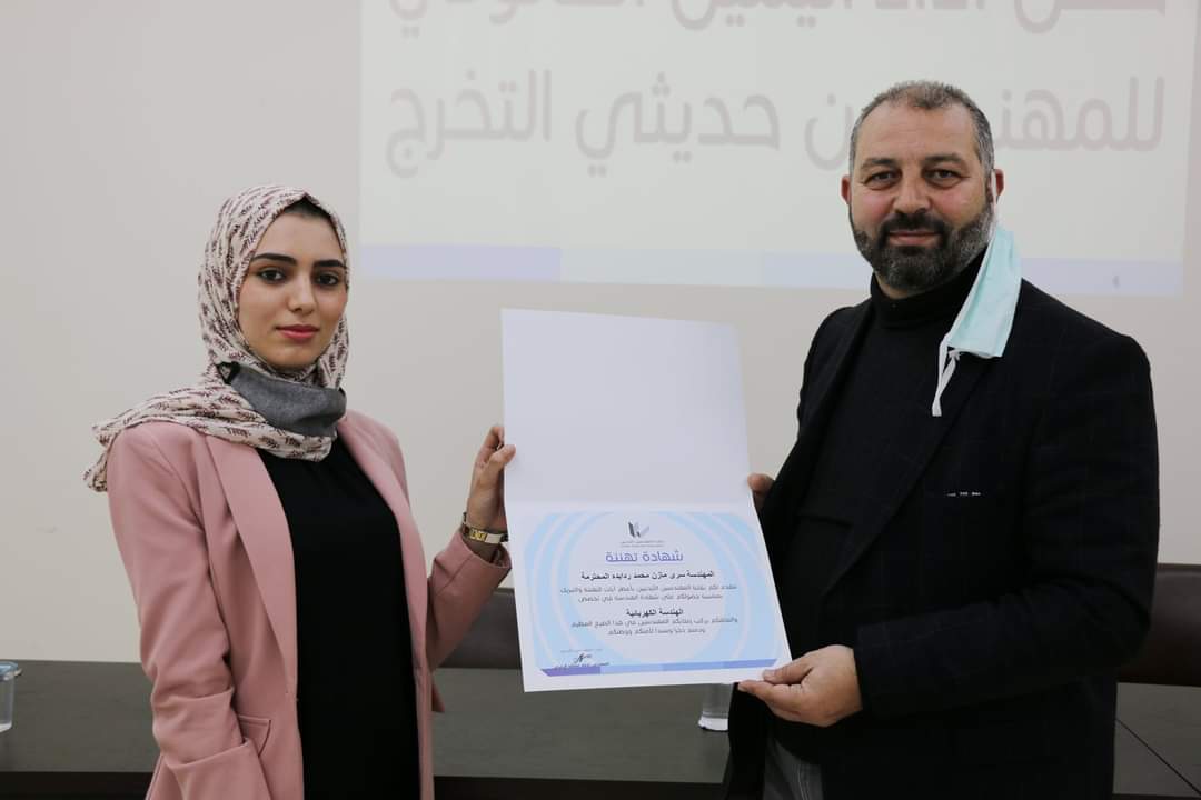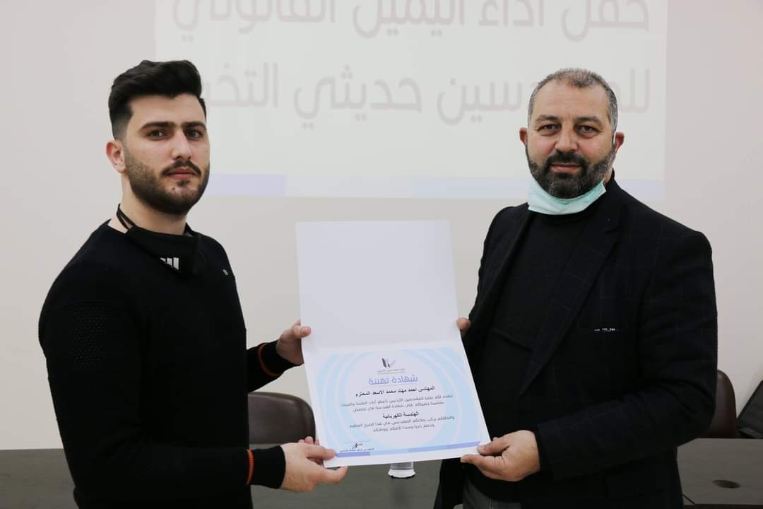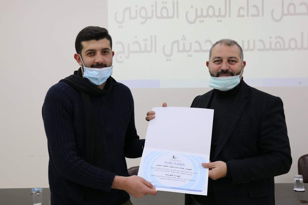 وتم إقامة الحفل ضمن الإجراءات الوقائية التي تضمن سلامة الزميلات والزملاء تفيذاً لأمر الدفاع الداعي إلى التباعد الإجتماعي وارتداء الكمامات، تسلم المهندسون الجدد في ختام الحفل بطاقات عضوية النقابة وشهادات تقدير.