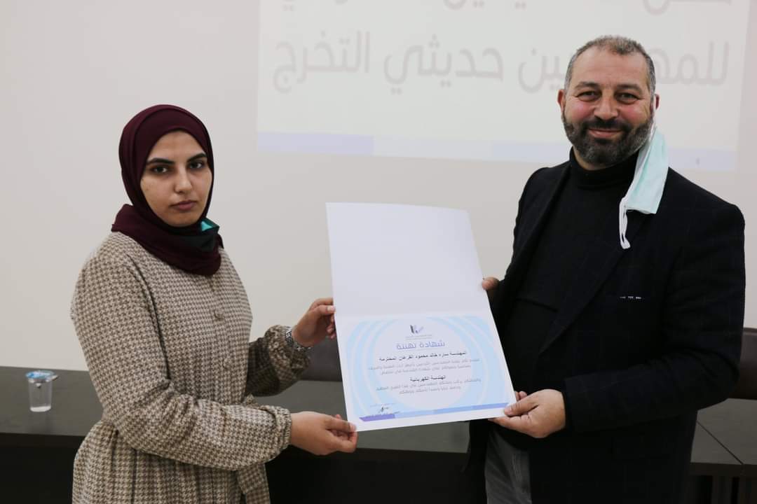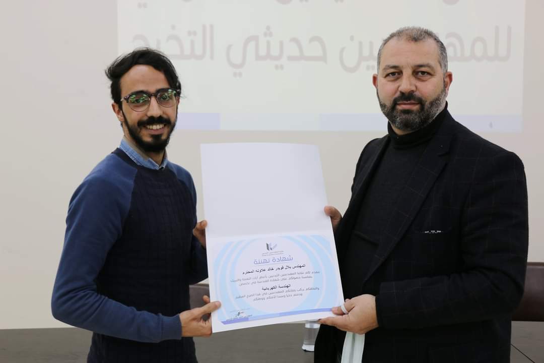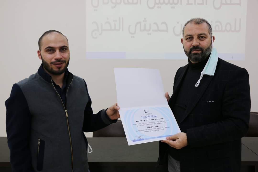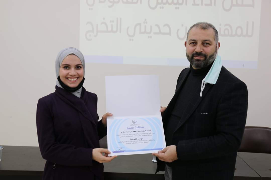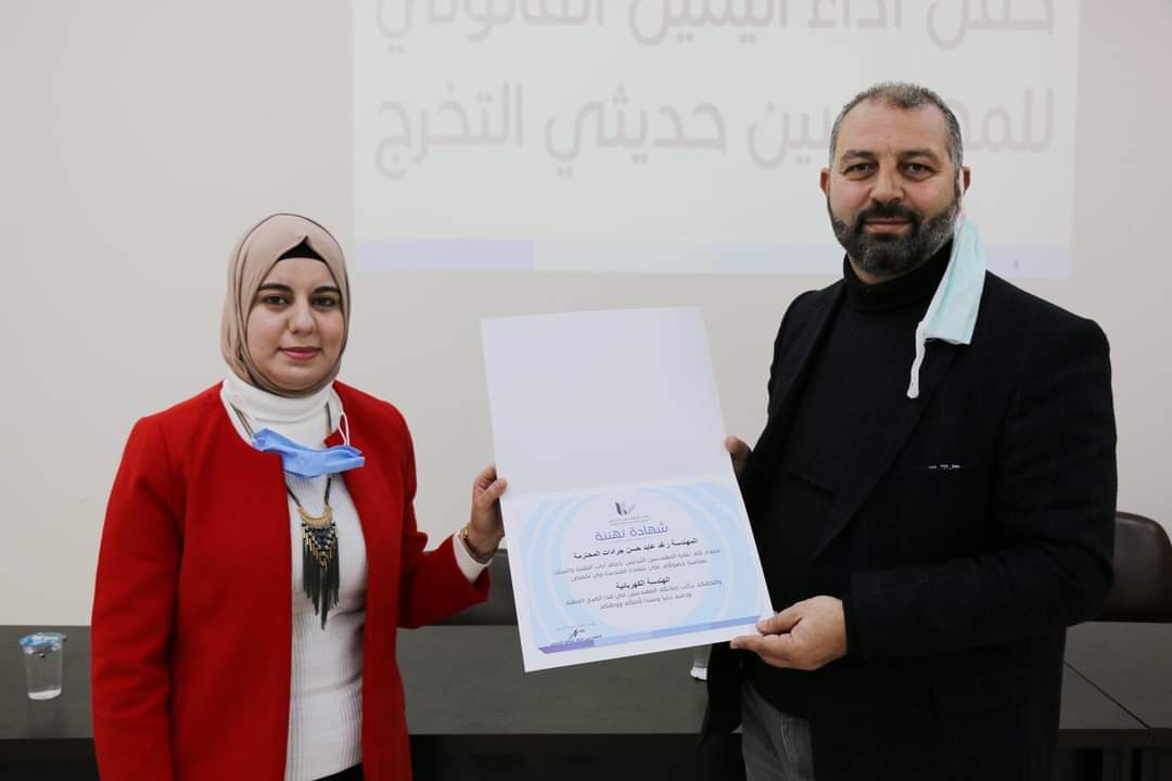 وتم إقامة الحفل ضمن الإجراءات الوقائية التي تضمن سلامة الزميلات والزملاء تفيذاً لأمر الدفاع الداعي إلى التباعد الإجتماعي وارتداء الكمامات، تسلم المهندسون الجدد في ختام الحفل بطاقات عضوية النقابة وشهادات تقدير.