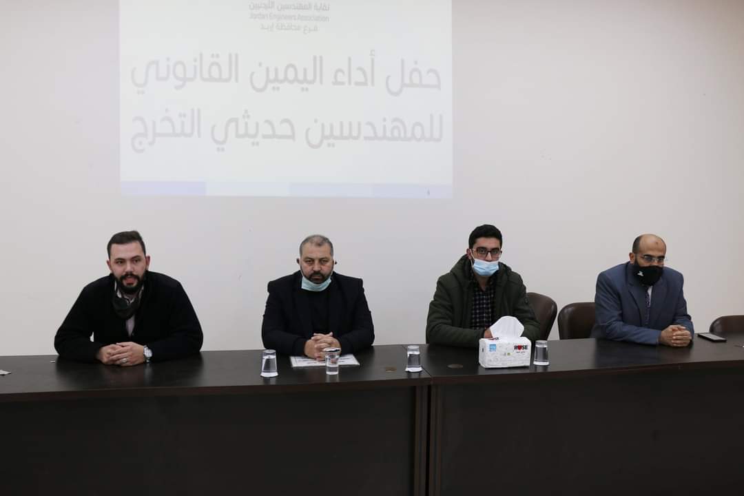 أدى 31 مهندساً ومهندسة اليمين القانونية، في فرع نقابة المهندسين الأردنيين في محافظة اربد يوم الإثنين 2021/2/8 للزملاء المهندسين في شعبة الهندسة المدنية وشعبة الهندسة الكهربائية، بحضور ممثلي مجلس نقابة المهندسين الأردنيين؛ رئيس مجلس فرع إربد الدكتور أحمد ملكاوي، ونائب رئيس مجلس الفرع الدكتور عصام طراد، وممثلاً عن الأمانة العامة؛ رئيس قسم اللجان المهندس رائد العطيوي.