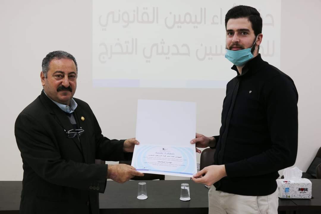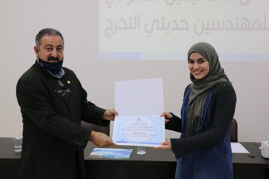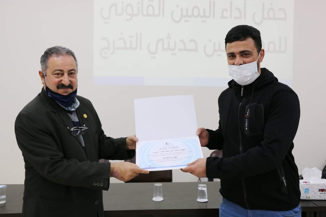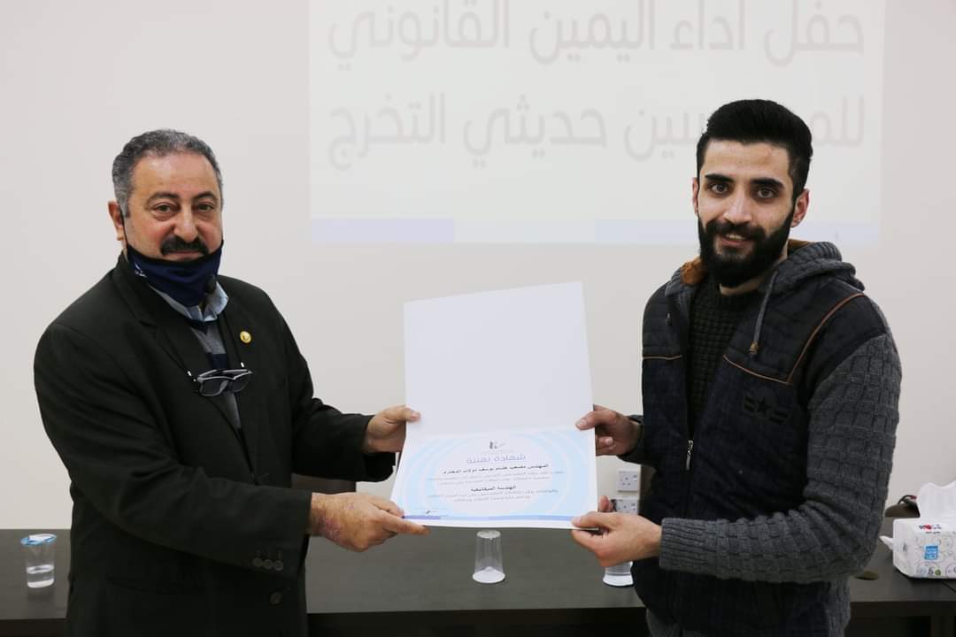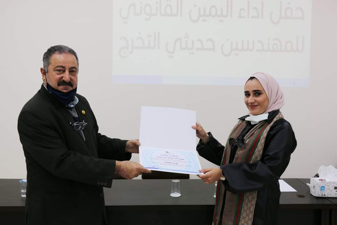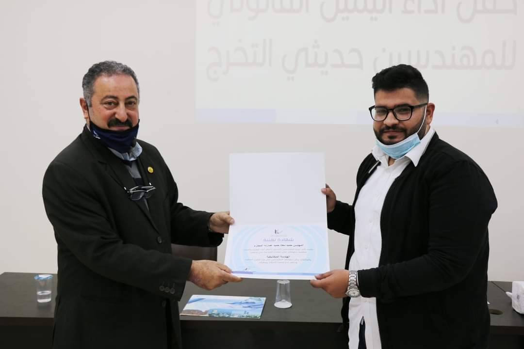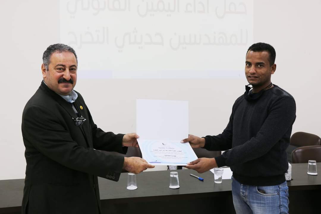 وتم إقامة الحفل ضمن الإجراءات الوقائية التي تضمن سلامة الزميلات والزملاء تفيذاً لأمر الدفاع الداعي إلى التباعد الإجتماعي وارتداء الكمامات، تسلم المهندسون الجدد في ختام الحفل بطاقات عضوية النقابة وشهادات تقدير.