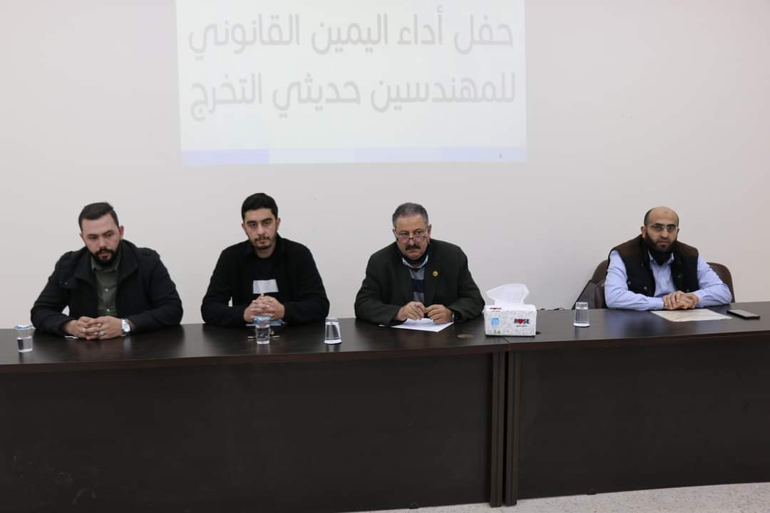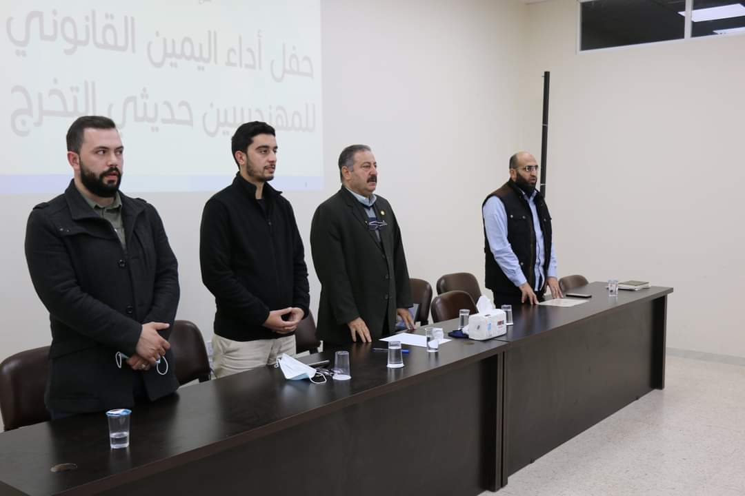أدى 45 مهندساً ومهندسة اليمين القانونية، في فرع نقابة المهندسين الأردنيين في محافظة اربد يوم الإثنين 2021/2/9 للزملاء المهندسين في الشعب الهندسية المعمارية، الميكانيكية، المناجم والتعدين، الكيماوية، بحضور ممثل مجلس نقابة المهندسين الأردنيين؛ أمين سر مجلس فرع إربد المهندس بسام السعدي، وممثلاً عن الأمانة العامة؛ رئيس قسم اللجان المهندس رائد العطيوي.