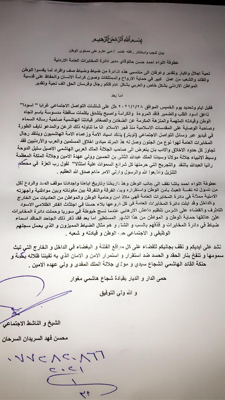 عطوفة اللواء احمد باشا نقف الى جانب الوطن وهذا تاريخنا وتاريخ اباءنا واجدادنا موقف الصد والردع لكل من تسول له نفسة العبث بأمن الوطن واستقراره وبث الفرقة بين مكوناته وبين مواطنية واجهزته الامنية ممثلة في دائرة المخابرات العامه فهي ملاذ أمن وحامية الوطن والمواطن من العاديات من الخارج والداخل وقد ابلت دائرة المخابرات العامه في كل فروعها بلاء حسنا في اجتثاث الفكر الظلامي الاسود المتطرف والقضاء على اشرس تنظيم داعش الارهابي عندما نسج خيوطة في سوريا وحملت دائرة المخابرات على عاتقها حماية الوطن والمواطن من هذا الشر المستطير اما بعد فقد ذكر ذلك الجاحد الحاقد اسماء ضباط في دائرة المخابرات وقذفهم بالسب والشتم وهم مثال الضباط المميزون والذي يحمل سجلهم الوظيفي والاجتماعي حب الوطن وقيادته وشعبه.