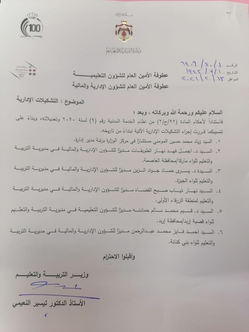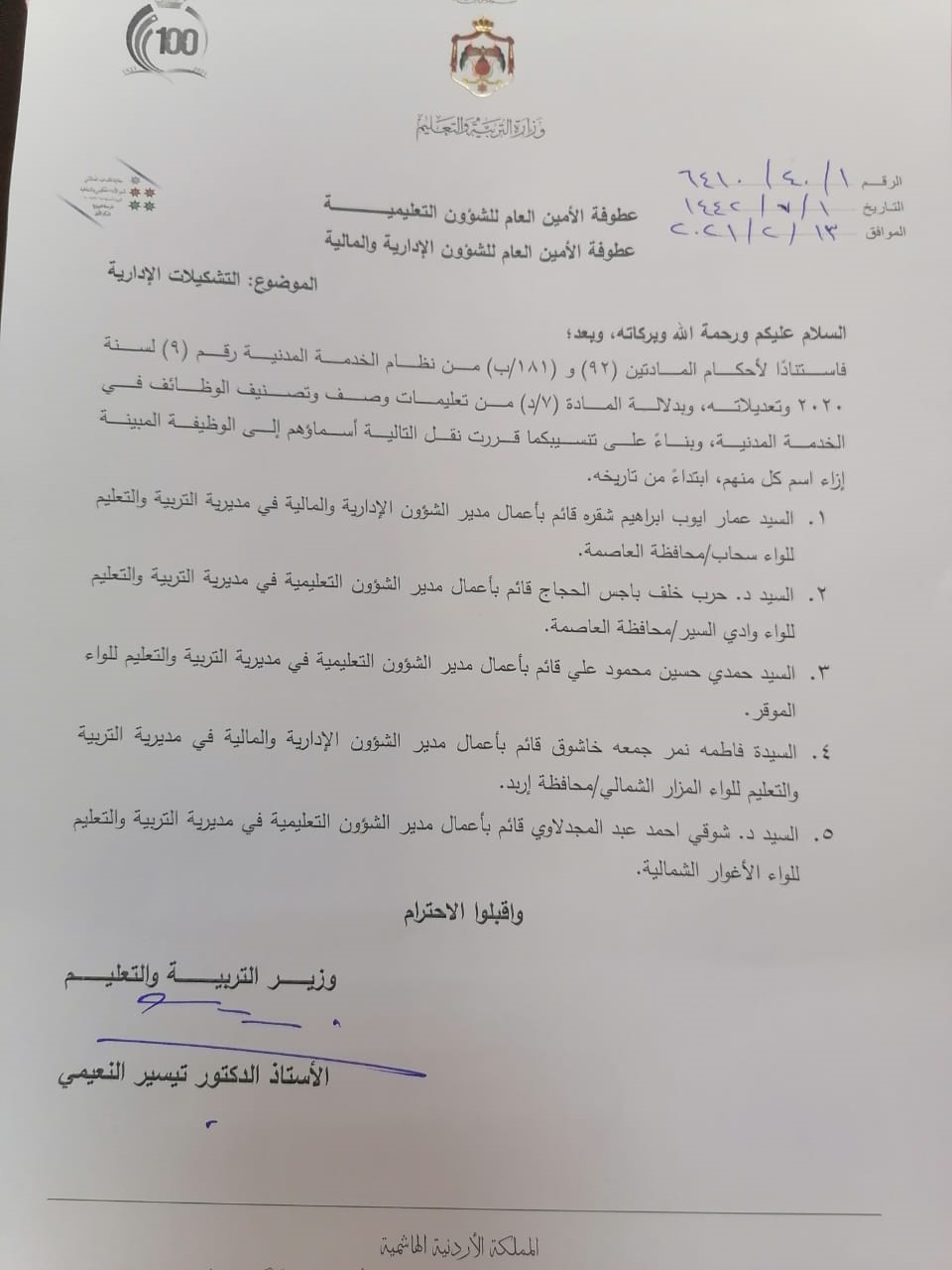 : قرر وزير التربية والتعليم ، الدّكتور تيسير النعيمي، إجراءَ التشكيلات الإدارية الآتية ابتداءً من تاريخ اليوم السبت 13/2/2021 :