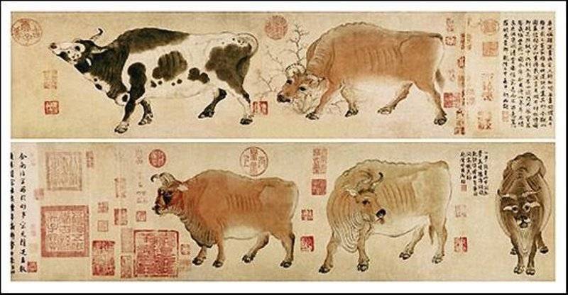 وقد وصف الأديب الكبير لوشيون روح التفاني الصامت للبقر "البقر يأكل العشب ويعطي الحليب للناس"، كما تزخر الثقافة الصينية برصيد ثري من الفنون والقصائد الشعرية الرائعة بموضوع البقر.