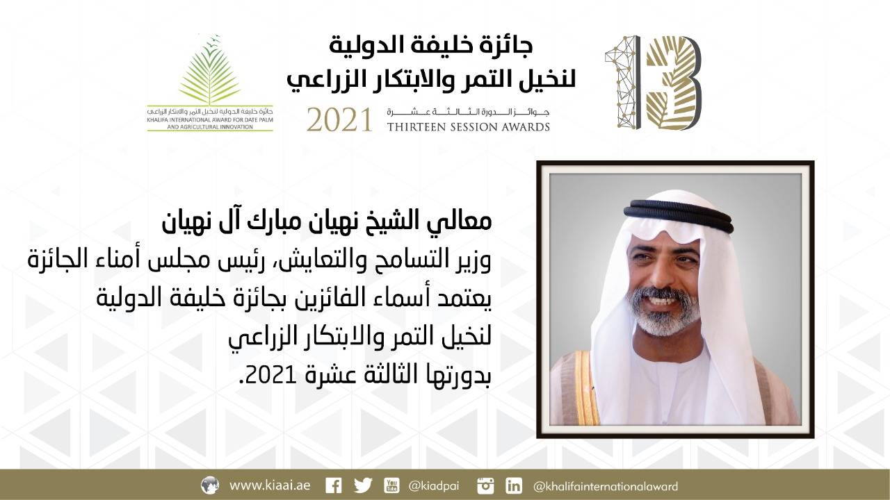 أعرب معالي الشيخ نهيان مبارك آل نهيان، وزير التسامح والتعايش، رئيس مجلس أمناء جائزة خليفة الدولية لنخيل التمر والابتكار الزراعي، عن تقديره للعناية السامية التي تلقاها الجائزة من القيادة الحكيمة لصاحب السمو الشيخ خليفة بن زايد آل نهيان، رئيس الدولة (حفظه الله)، ودعم صاحب السمو الشيخ محمد بن زايد آل نهيان ولي عهد أبوظبي، نائب القائد الأعلى للقوات المسلحة، ودعم سمو الشيخ منصور بن زايد آل نهيان، نائب رئيس مجلس الوزراء، وزير شؤون الرئاسة. ما دفع الجائزة قدماً كي تتبوأ موقعها الريادي الذي وصلت إليه على المستويين المحلي والعربي والدولي، وساهم في تعزيز دور الإمارات في خدمة شجرة نخيل التمر والابتكار الزراعي حول العالم.