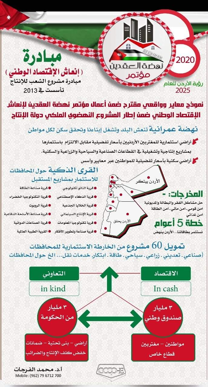 في إتصال وردنا من مؤسس منتدى النهضة الأستاذ الدكتور محمد الفرجات، قال بأن نموذج المدينة الذكية ومشاريع المستقبل فيها وطريقة تمويلها، والمراحل التي عاير فيها القائمون على منتدى النهضة نموذج الطرح، بدأت كجهود للمنتدى منذ صيف ٢٠١٦، وأن المنتدى عبر مبادرته إنعاش الإقتصاد الوطني حمل النموذج إلى مدير مكتب جلالة الملك، وإلى معالي رئيس الديوان الملكي، وإلى مجلسي الأعيان والنواب، وإلى مجلس الوزراء، وروج للطرح وأهميته عبر عدة مؤتمرات وورشات عمل، إضافة لكل وسائل الإعلام والسوشيال ميديا.