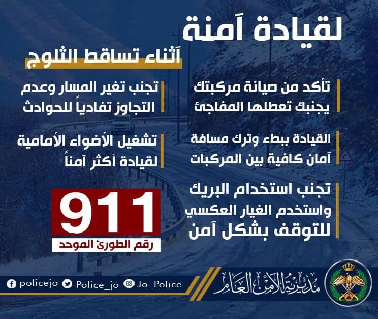 مديرية الأمن العام تدعو لاخذ اقصى درجات الحيطة واتباع السلوك الوقائي خلال المنخفض الجوي المتوقع.