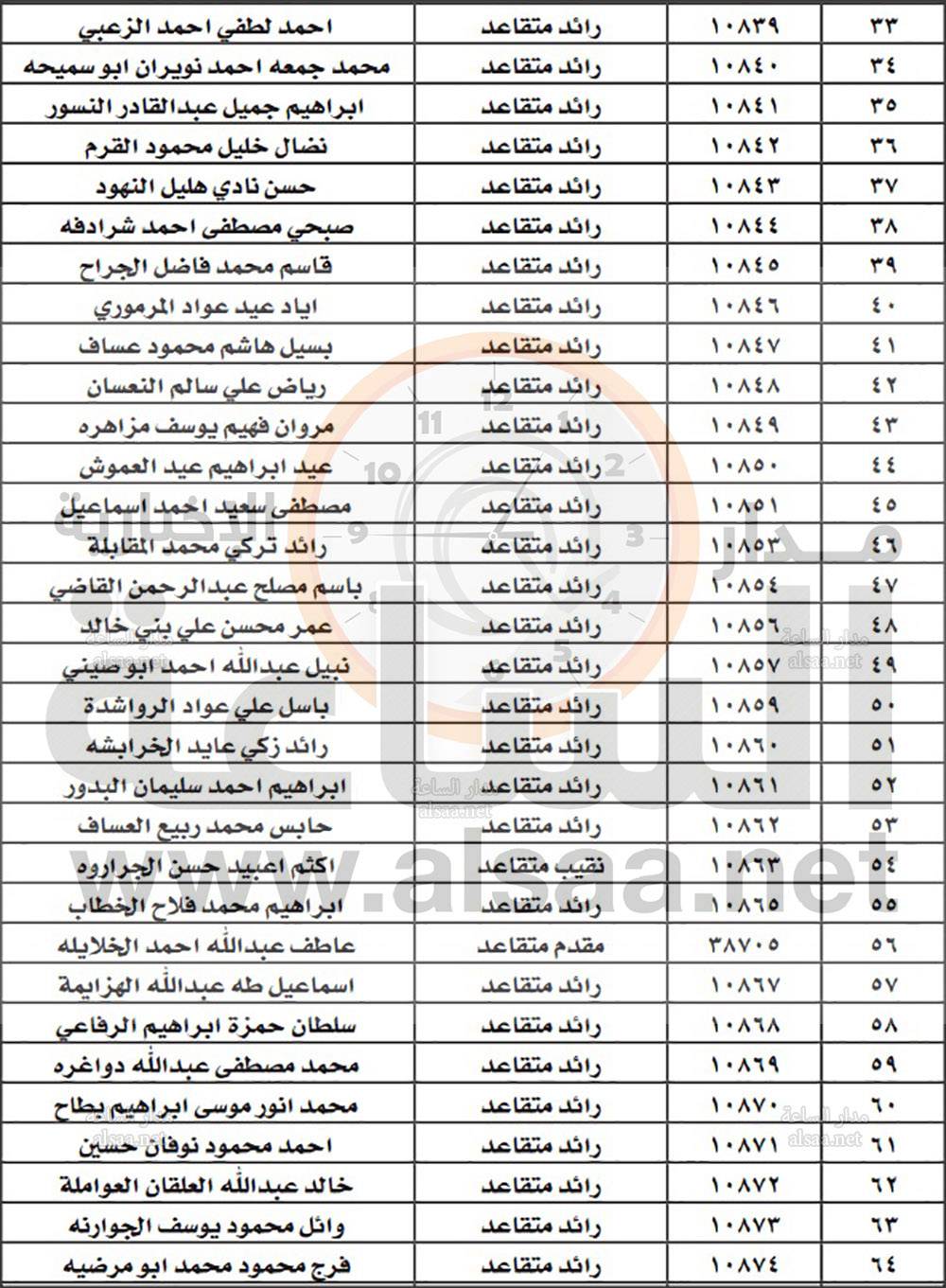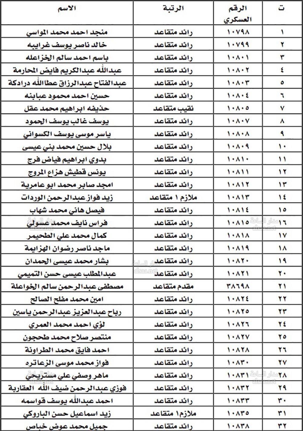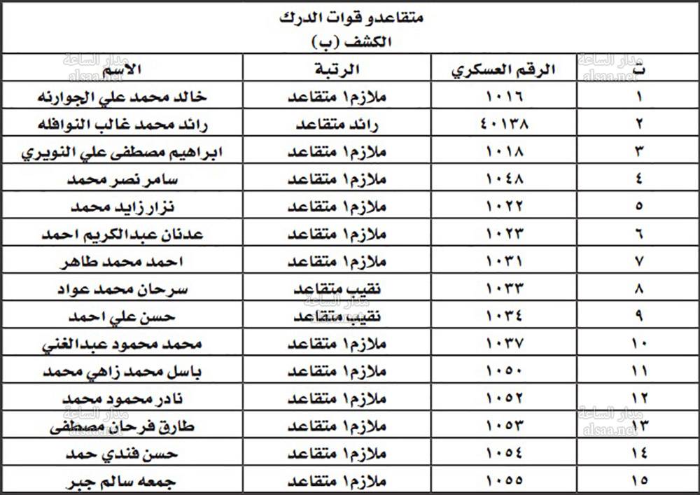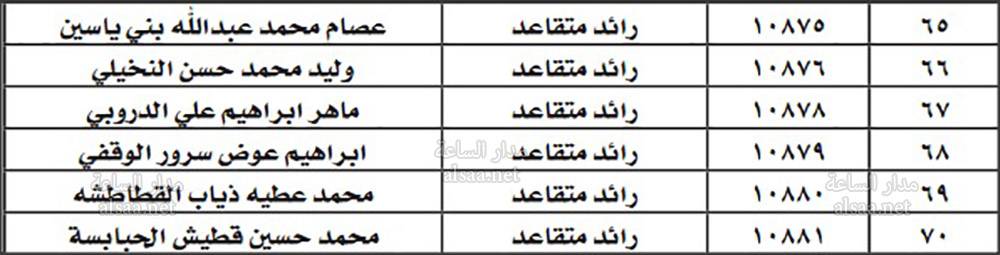 تنفيذا للتوجيهات الملكية وتوجيهات مدير الأمن العام بمناسبة يوم الوفاء للمتقاعدين العسكريين والمحاربين القدامى، دعت مديرية الامن الضباط المتقاعدين المبينة اسماؤهم تاليا مراجعة المديرية ـ ادارة الابنية ـ صندوق اسكان ضباط الامن اعتبارا من اليوم الاربعاء واحضار الوثائق المبينة بادنه لاستكمال الاجراءات تمهيدا لصرف قروض الاسكان الخاصة بهم: