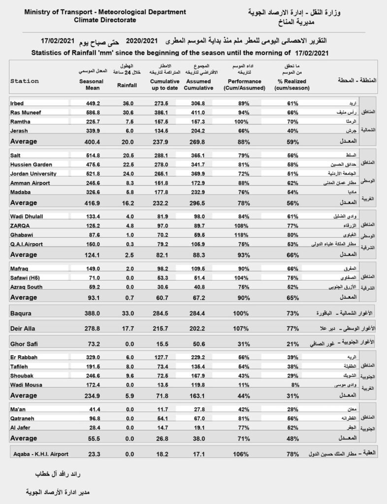 اربد كانت الأعلى هطولا منذ مساء الأمس حيث سجلت 36 ملم ، تليها منطقة راس
