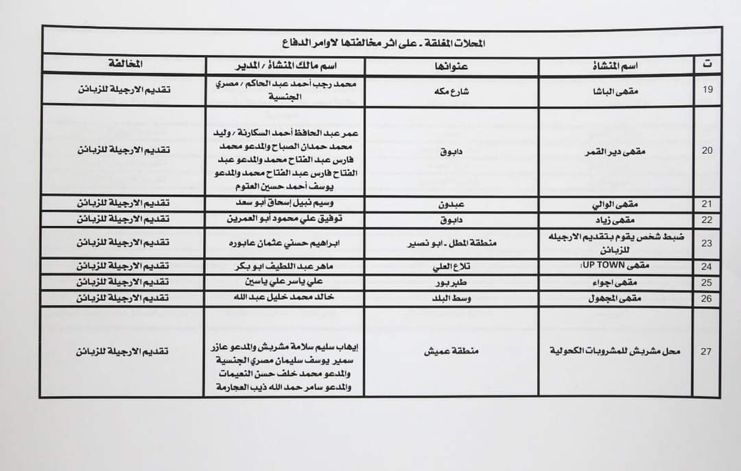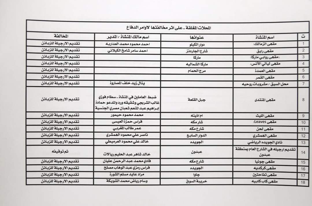 وتاليا أسماء اصحاب المقاهي والمنشآت الذين تم تسجيل مخالفات أوامر الدفاع بحقهم: