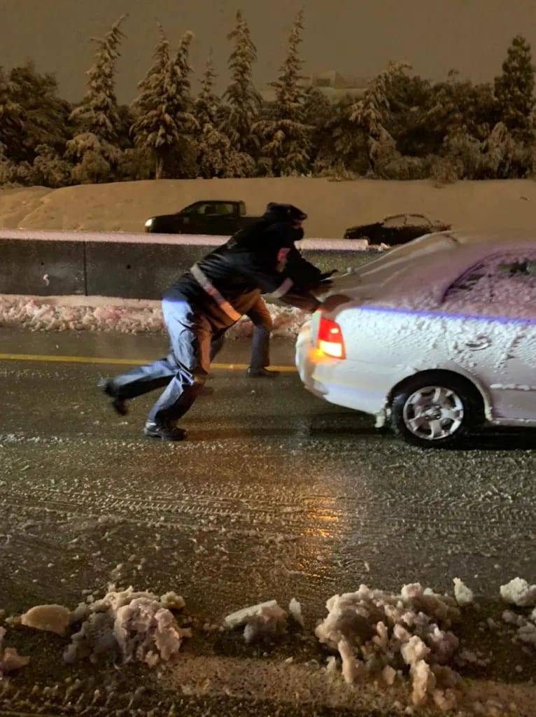 ورصدت عدسة الغد فجر اليوم قيام العميد حاتم مواجده قائد امن أقليم العاصمة والعميد فراس الصعوب مدير ادارة السير وهما يقومان بمساعدة السائقين العالقين للوصول إلى منازلهم بأمان في شوارع عمان.