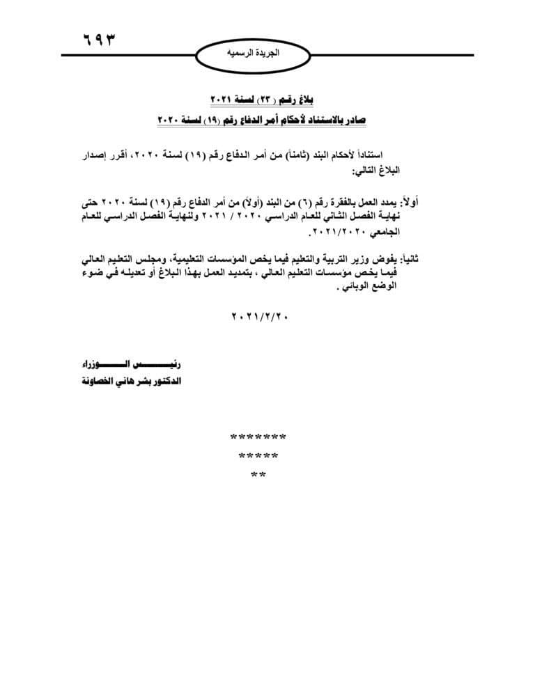 اصدر رئيس الوزراء الدكتور بشر الخصاونة بلاغ رقم (23) لسنة 2021 بالاستناد لأحكام أمر الدفاع رقم (19) لسنة 2020