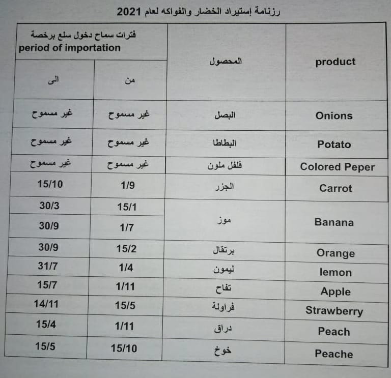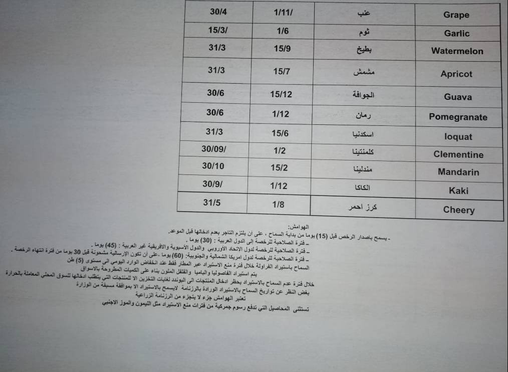 وتؤكد الوزارة على ضرورة الحصول على رخصة استيراد مسبقة وحسب الشروط المعتمدة في نماذج الاستيراد ولن يتم ادخال اي ارسالية تستورد مخالفة لما ورد في الروزنامة الزراعية.