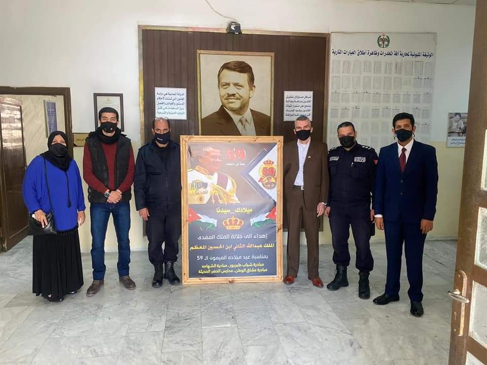 حيث اشتملت المبادرة على وضع صورة لجلالة الملك امام مكتب الاستقبال في المركز الأمني وتم توزيع الحلوى على مرتبات المركز .