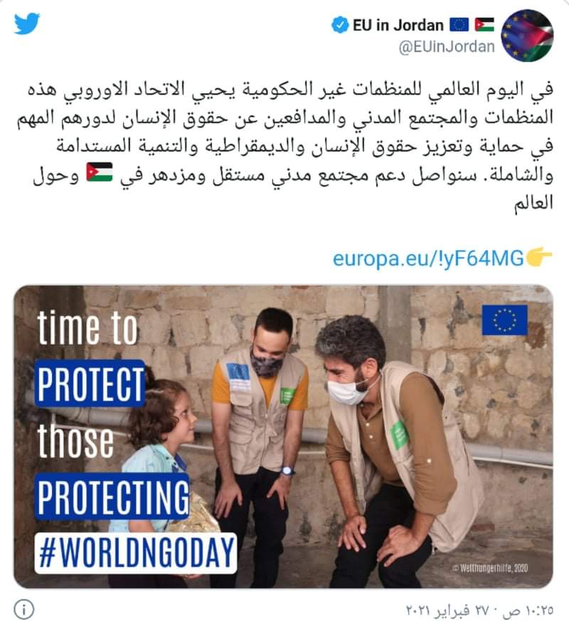 وقالت البعثة، عبر حسابها على منصة تويتر السبت، "في اليوم العالمي للمنظمات غير الحكومية يحيي الاتحاد الأوروبي هذه المنظمات والمجتمع المدني والمدافعين عن حقوق الإنسان لدورهم المهم في حماية وتعزيز حقوق الإنسان والديمقراطية والتنمية المستدامة والشاملة. سنواصل دعم مجتمع مدني مستقل ومزدهر في الأردن وحول العالم”.