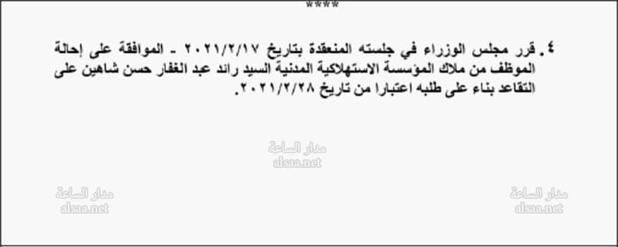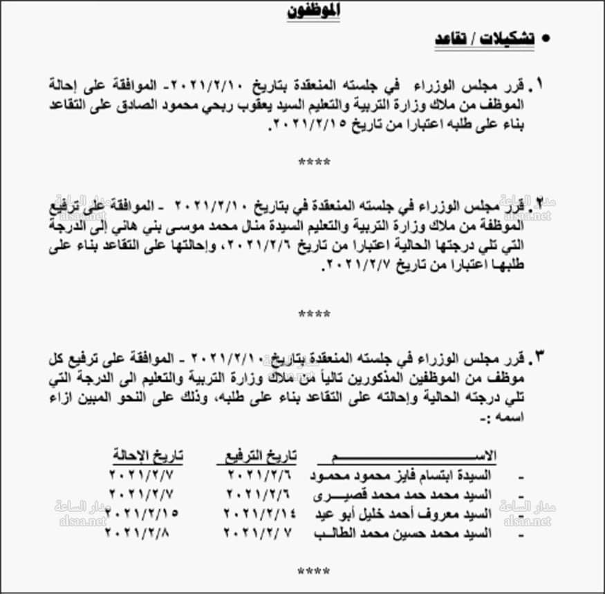 قرر مجلس الوزراء إحالة موظفين في عدد من الوزارات والدوائر إلى التقاعد.