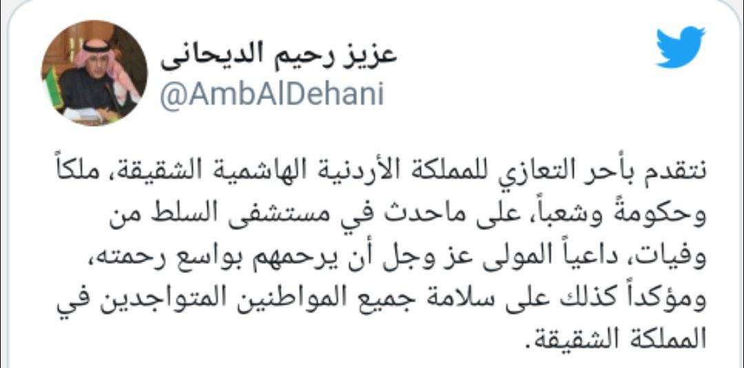 قدم السفير الكويتي لدى الاردن عزيز الديحاني، اليوم السبت، تعازي دولة الكويت، بشهداء مستشفى السلط.
