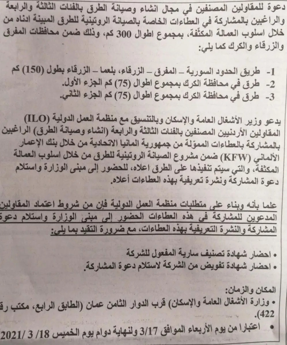 ودعا الكسبي بالتنسيق مع منظمة العمل الدولية، المقاولين الأردنيين المصنفين بالفئات الثالثة والرابعة ( انشاء وصيانة الطرق) الراغبين بالمشاركة بالعطاء الممول من ألمانيا عبر بنك الأعمار الألماني ضمن مشروع الصيانة الروتينية للطرق من خلال أسلوب العمالة المكثفة، للحضور إلى مبنى الوزارة واستلام دعوة المشاركة.