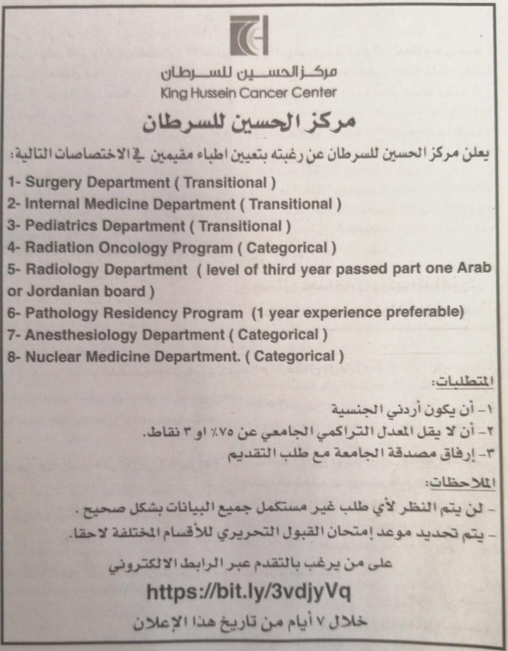 أعلن مركز الحسين للسرطان الأحد، عن رغبته بتعيين أطباء مقيمين في عدة اختصاصات.