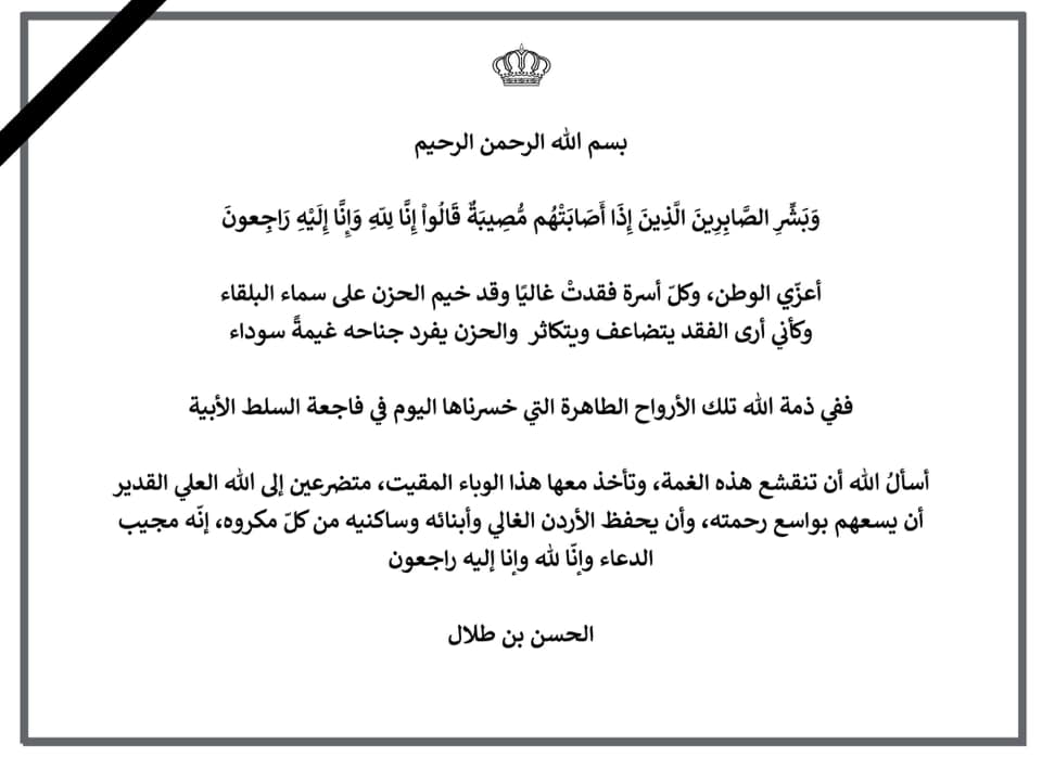 الأمير الحسن : واجب العزاء للأردن ولأهالي الضحايا بهذا المصاب الأليم..