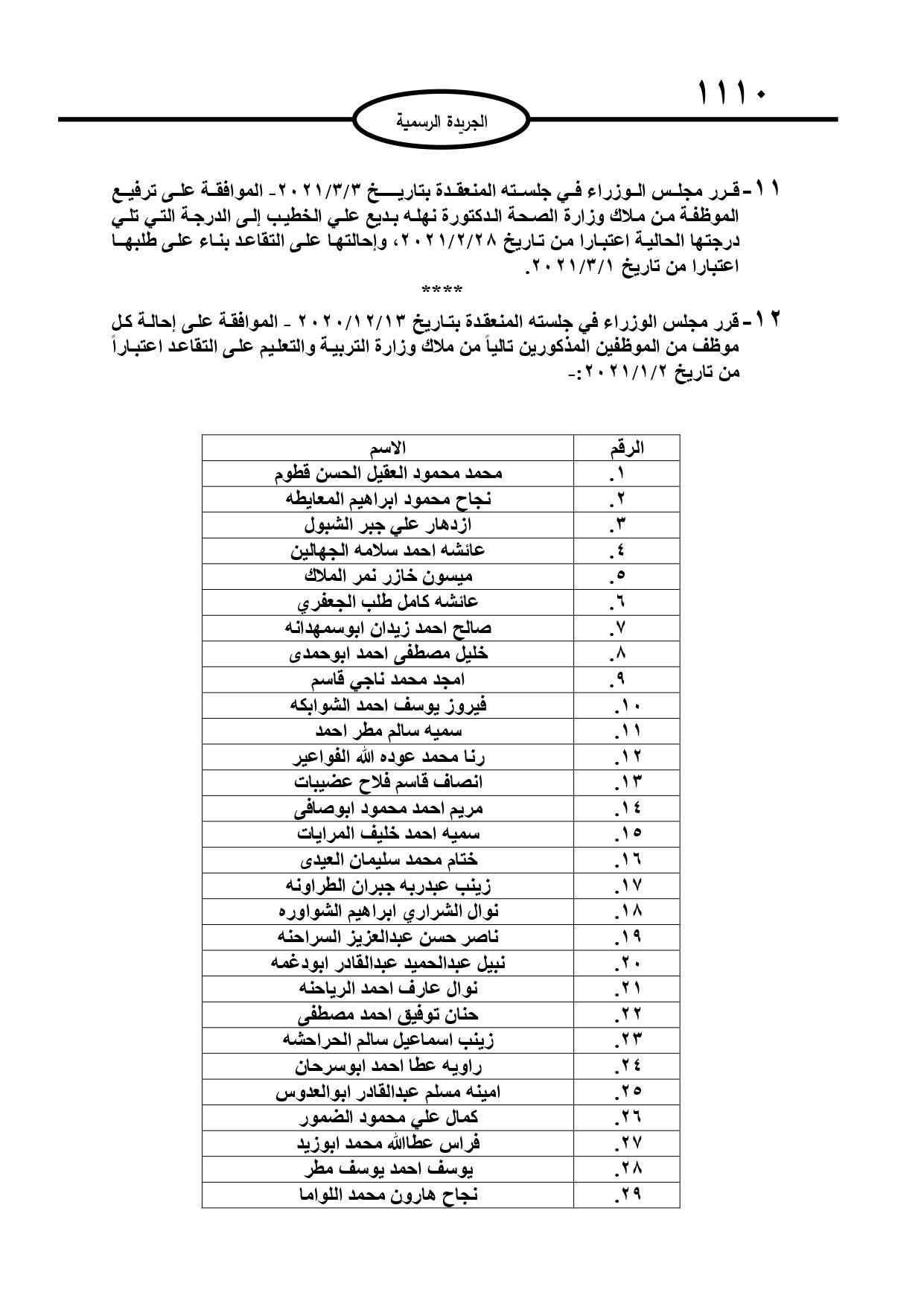 كما وافق مجلس الوزراء على ترفيع عدد من الموظفين في وزارات ومؤسسات أخرى، وفق ما صدر في الجريدة الرسمية اليوم الثلاثاء.