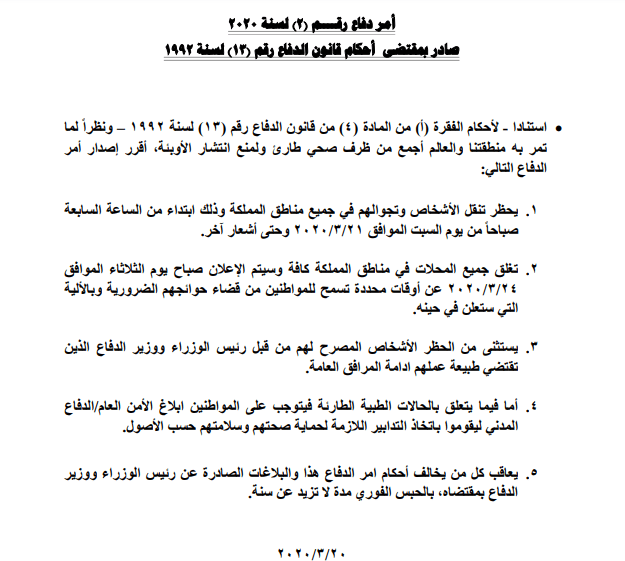 يصادف بعد غد الأحد، 21 اذار، مرور عام على أول حظر شامل شهده الأردن بسبب فيروس كورونا المستجد، والذي أقرته الحكومة في 20 آذار .