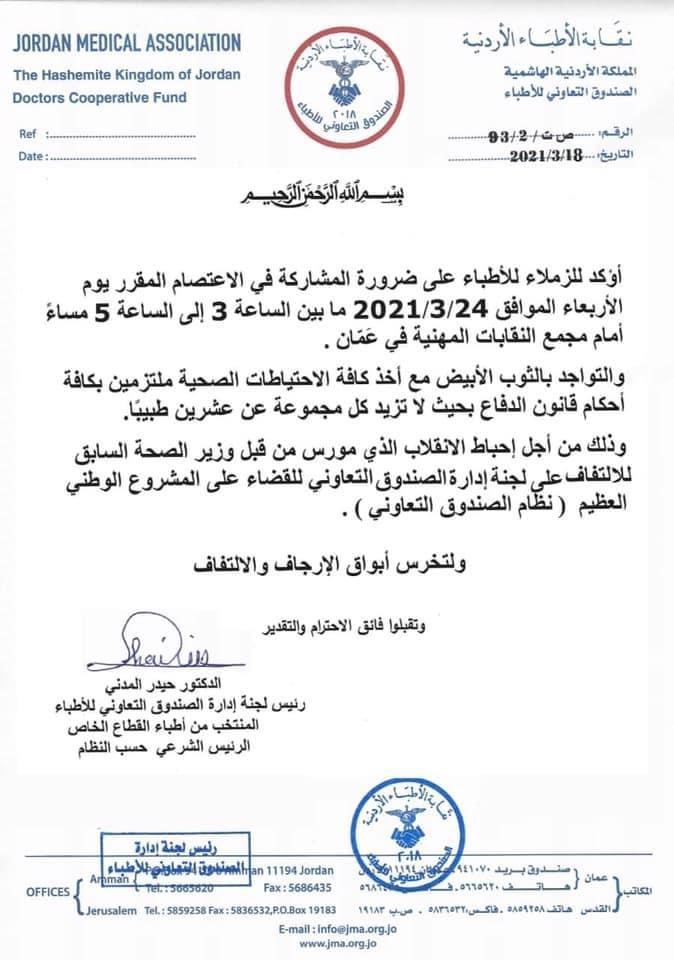 تدعو جمعية الاطباء الرواد جميع الاطباء والرواد منهم الى عدم المشاركة في اعتصام 24/3/2021 الذي دعا اليه الدكتور حيدر المدني في رسالته الصوتية المسجلة ثم في رسالته الخطية المؤرخة في 18/3/2021 .