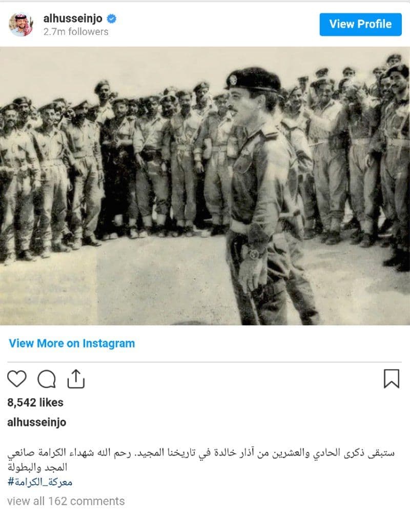 استذكر سمو ولي العهد الأمير الحسين بن عبدالله الثاني، اليوم الأحد، الذكرى الـ 53 لمعركة الكرامة الخالدة.