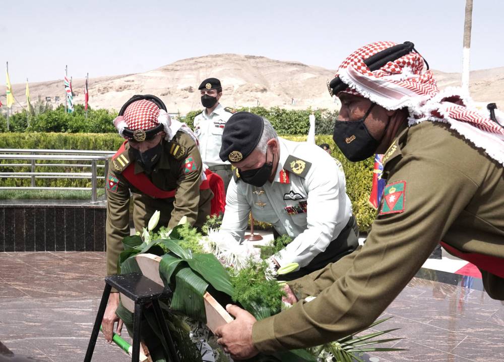 وعزفت الموسيقى السلام الملكي، كما وضع جلالة الملك إكليلا من الزهور على الصرح التذكاري لشهداء معركة الكرامة.