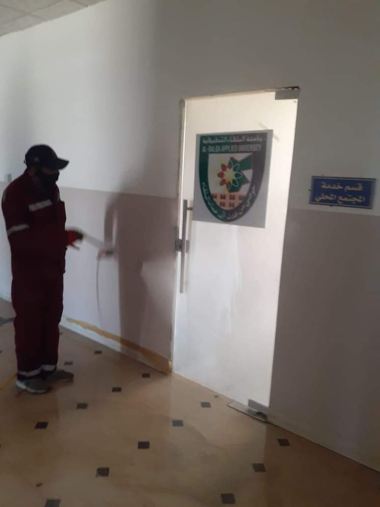 تماشياً مع حملة جامعة البلقاء التطبيقية لتعقيم كافة مرافق الجامعة والاستعدادات والإجراءات الوقائية التي تتعلق بمكافحة فيروس كورونا المستجد وتجسيدًا للخطة الوطنية الشاملة للحفاظ على الوطن خاليًا من هذا الفيروس المستجد وضمن الإمكانات المتاحة وتنفيذًا لإيعاز رئيس جامعة البلقاء التطبيقية الأستاذ الدكتور عبدالله سرور الزعبي و تحت إشراف عميد الكلية الأستاذ الدكتور باسم اللوزي ،قامت الكلية بتعقيم كافة المرافق من ممرات وقاعات تدريس ومكاتب ودورات المياه بالإضافة إلى توفير كافة المستلزمات والإجراءات اللازمة للحفاظ على الكلية و أسرتها من فيروس كورونا كتوزيع مواد التعقيم في كافة مرافق الكلية.