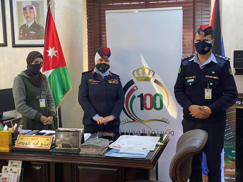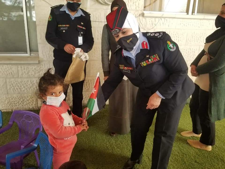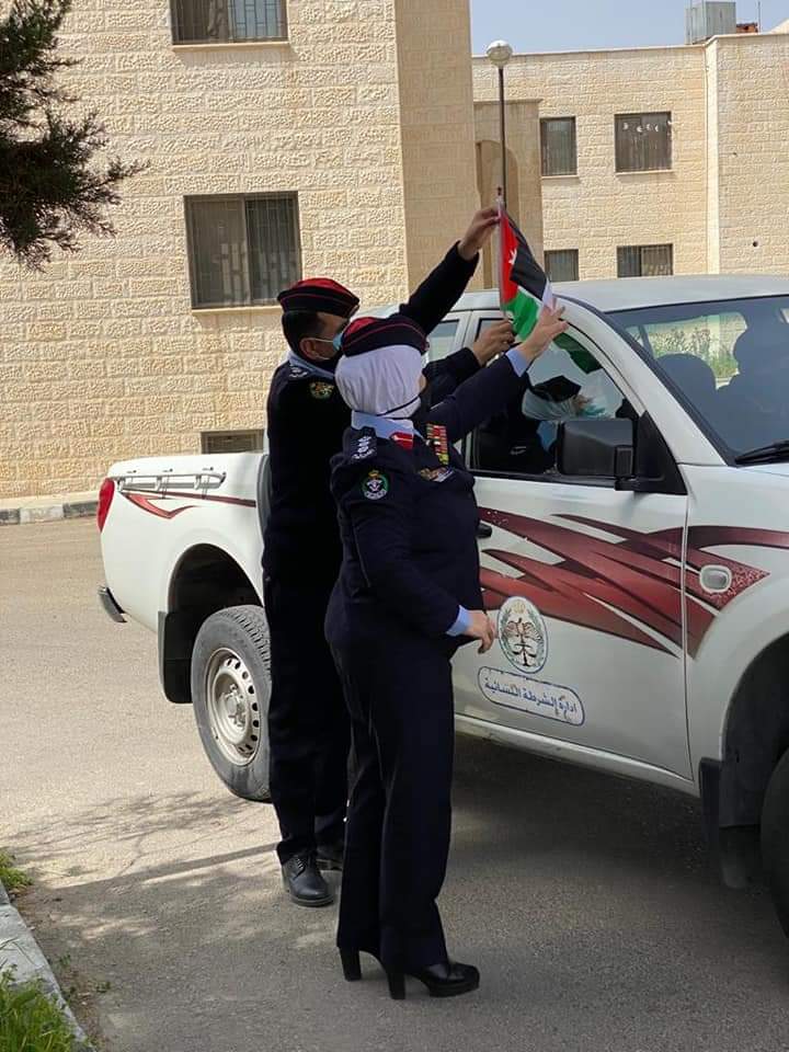 من جانب آخر قامت الشرطة المجتمعية في مركز أمن الزهور في مديرية شرطة جنوب عمان وبالتنسيق مع أعضاء المجلس الأمني المحلي لديهم وبمناسبة يوم الام بزيارة الى ادارة الشرطة النسائية، حيث تم الالتقاء مع العقيد منى ابو عوده وتوزيع الأعلام على مركبات الادارة والكمامات على اطفال حضانة الادارة ووضع لوحات إرشادية عن مخاطر فايروس كورونا .