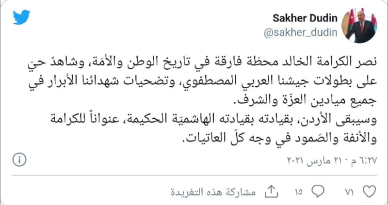 وقال عبر تويتر "نصر الكرامة الخالد محطّة فارقة في تاريخ الوطن والأمّة، وشاهدٌ حيّ على بطولات جيشنا العربي المصطفوي، وتضحيات شهدائنا الأبرار في جميع ميادين العزّة والشرف.”.