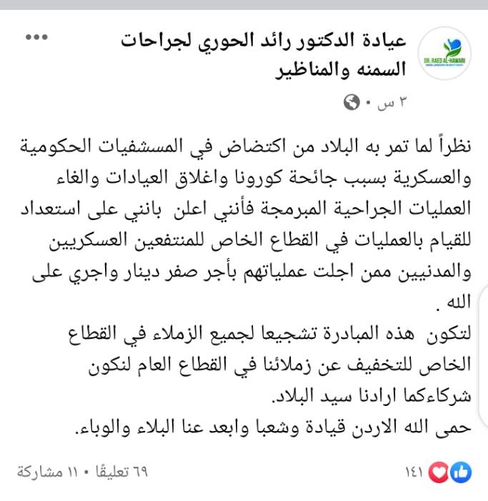 أعلن اخصائي الجراحة العامة وجراحة السمنة والتنظير  الطبيب رائد الحوري من خلال صفحته بالفيس بوك  اليوم الأربعاء عن استعداده للقيام بإجراء العمليات في القطاع الخاص للمنتفعين العسكريين والمدنيين ممن أجلت عملياتهم بأجر صفر دينار  احتسابًا لله عز وجل .