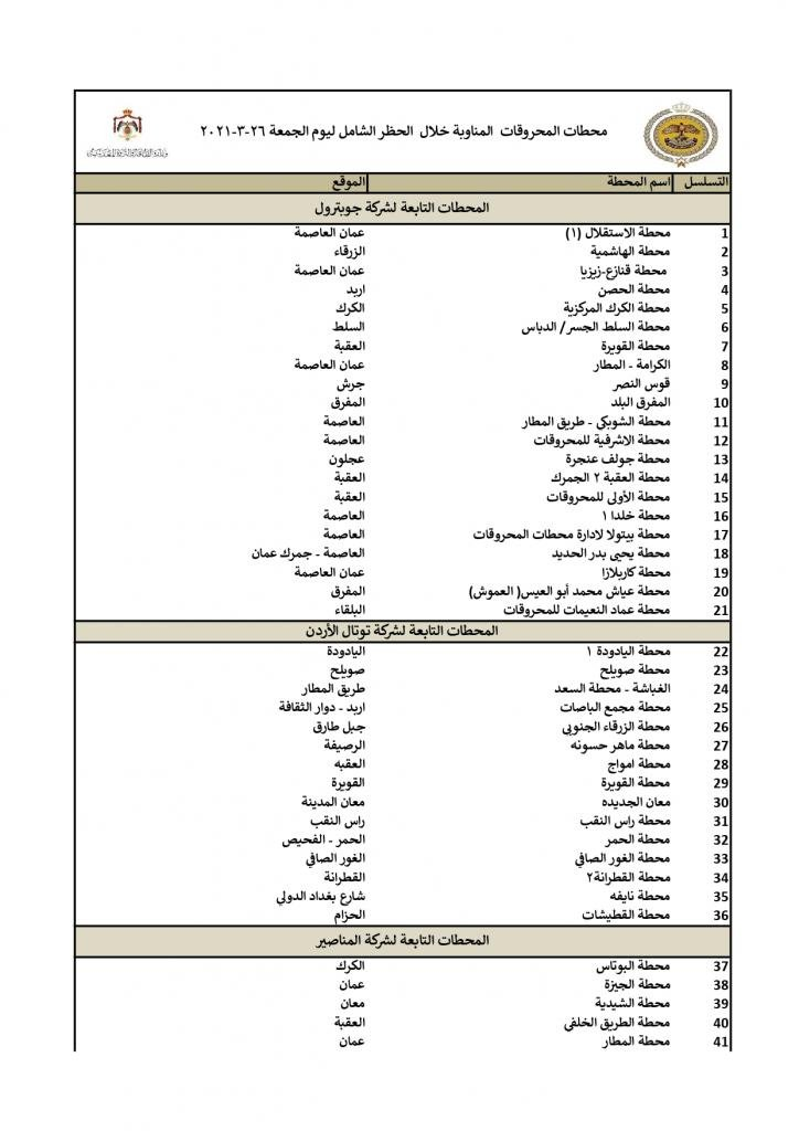 : أعلنت وزارة الطاقة والثروة المعدنية الخميس، محطات المحروقات العاملة في حظر التجول الشامل المفروض حتى صباح السبت، للحد من تداعيات فيروس (كورونا المستجد- كوفيد19)، وعددها 133 محطة، موزعة على مختلف مناطق المملكة.