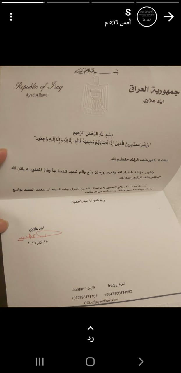ارسل رئيس حكومة العراق المؤقتة في عام 2004  اياد علاوي أمس الخميس  برقية تعزية ومواساة لعائلة الدكتور خلف الرقاد معربًا من خلالها عن حزنه بوفاة الدكتور خلف الرقاد الذي وافته المنية قبل أيام .