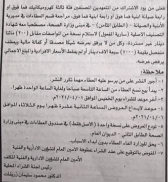 ودعا الدكتور زريقات، الراغبين بالاشتراك في العطاءات مراجعة قسم العطاءات في مديرية الأبنية والصيانة في مبنى الوزارة، مصطحبا معه شهادة التصنيف الأصلية لاستلام نسخة من المواصفات مقابل 200 دينار غير مستردة.