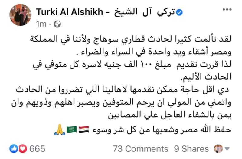 نشر المستشار تركى آل الشيخ، منشور على صفحته الرسمية على فيس بوك قال فيه، " لقد تألمت كثيرا لحادث قطاري سوهاج ولأننا في المملكة العربية السعوديةومصر أشقاء ويد واحدة في السراء والضراء".