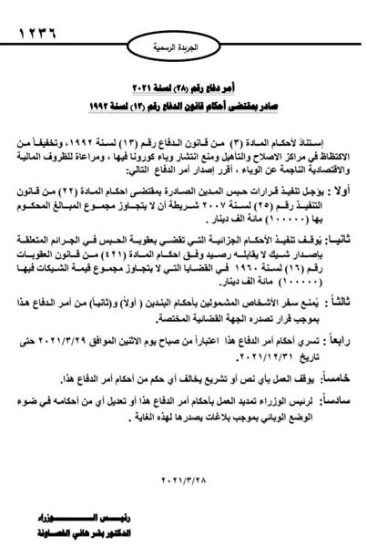 نشرت رئاسة الوزراء في الجريدة الرسمية ، النص الكامل لأمر الدّفاع رقم (28) لسنة 2021م، الذي يتيح استمرار إجراءات التقاضي، وطلب تثبيت الحقوق بين الدائن والمدين، دون تنفيذ إجراءات الحبس بحقّ المدين، حتّى تاريخ 31/12/2021م، مع التأكيد على منع المدين من السفر لحين قضاء الدّين.