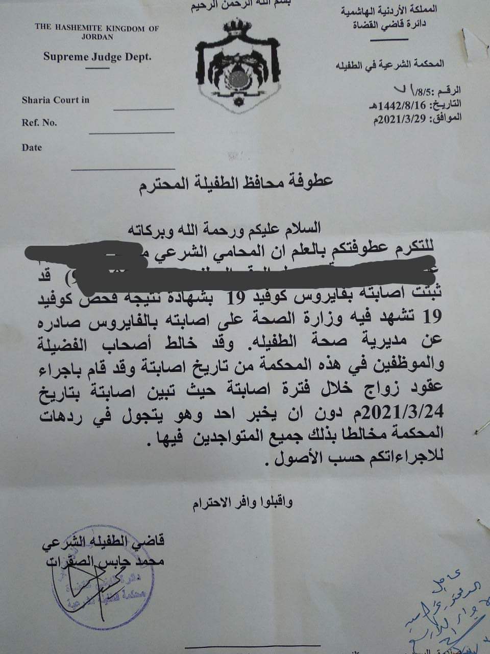 وفي تفاصيل الكتاب الذي ارسله قاضي محكمة الطفيلة الشرعي محمد حابس الصقرات، إلى محافظ الطفيلة قال فيه، "ثبتت شهادة صادرة عن وزارة الصحة بإصابة المحامي الشرعي بفايروس كيوفيد 19 بتاريخ 24/3/2021 وقد اخفى اصابته وخالط قضاة المحكمة والموظفين وقام بالتجول بالردهات وايضاً انشأ عقود زواج".