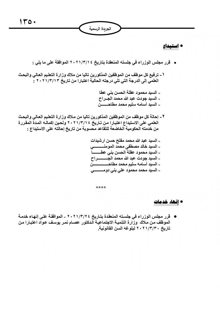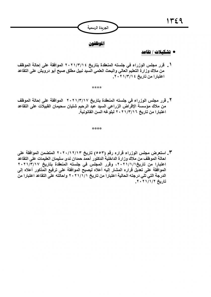 صدر في عدد الجريدة الرسمية اليوم الخميس قرارات مجلس الوزراء باحالة عدد من موظفي الدولة الى التقاعد وانهاء خدمات اخرين.