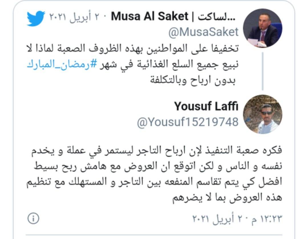 وقال الساكت في تغريدة له عبر حسابه على تويتر، "تخفيفا على المواطنين بهذه الظروف الصعبة لماذا لا نبيع جميع السلع الغذائية في شهر رمضان المبارك بدون ارباح وبالتكلفة".