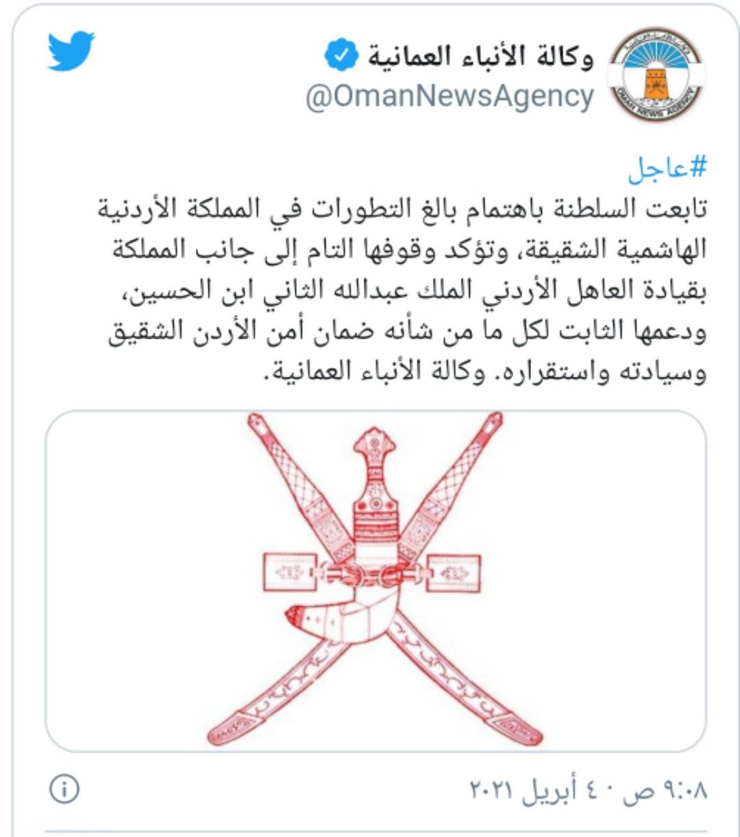 نيروز الإخبارية : قالت سلطنة عمان إنها تابعت باهتمام بالغ التطورات في المملكة الأردنية الهاشمية الشقيقة، بحسب وكالة الأنباء العمانية.