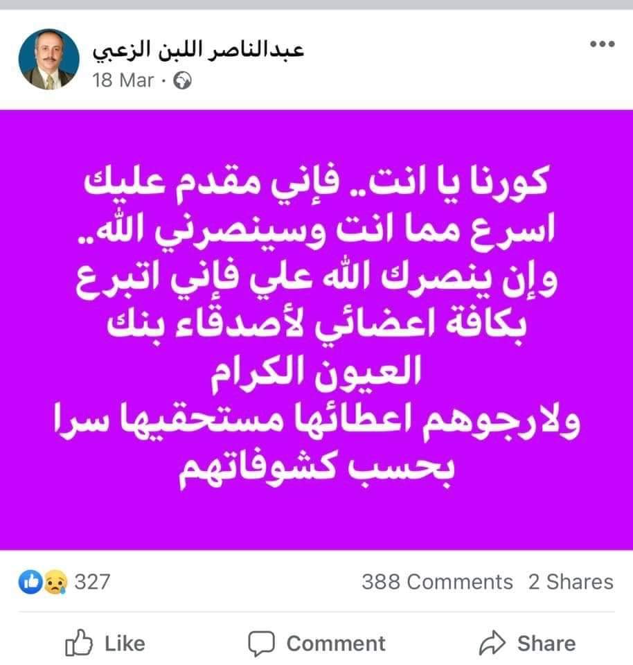 وقال الزعبي كورونا يا انت فإني مقدم عليك اسرع مما أنت وسينصرني الله .