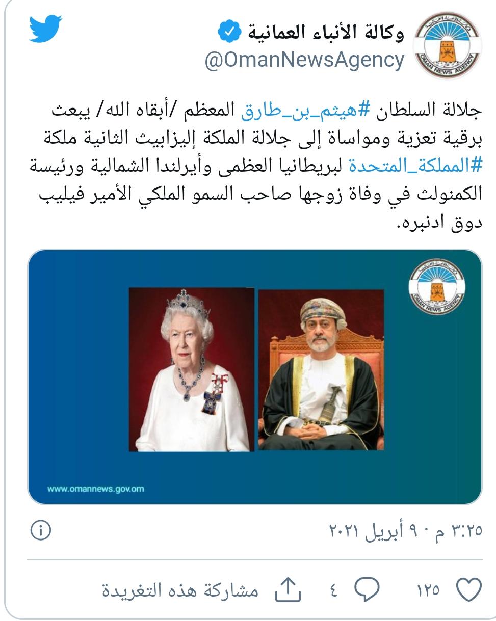 وأفادت وكالة الأنباء العمانية بأن السلطان هيثم بن طارق بعث برقية تعزية ومواساة إلى الملكة إليزابيث الثانية ملكة المملكة المتحدة في وفاة زوجها الأمير فيليب.