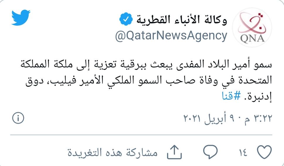 وبعث أمير قطر الشيخ تميم بن حمد آل ثاني ببرقية تعزية إلى ملكة المملكة المتحدة في وفاة الأمير فيليب، حسبما ذكرت وكالة الأنباء القطرية.