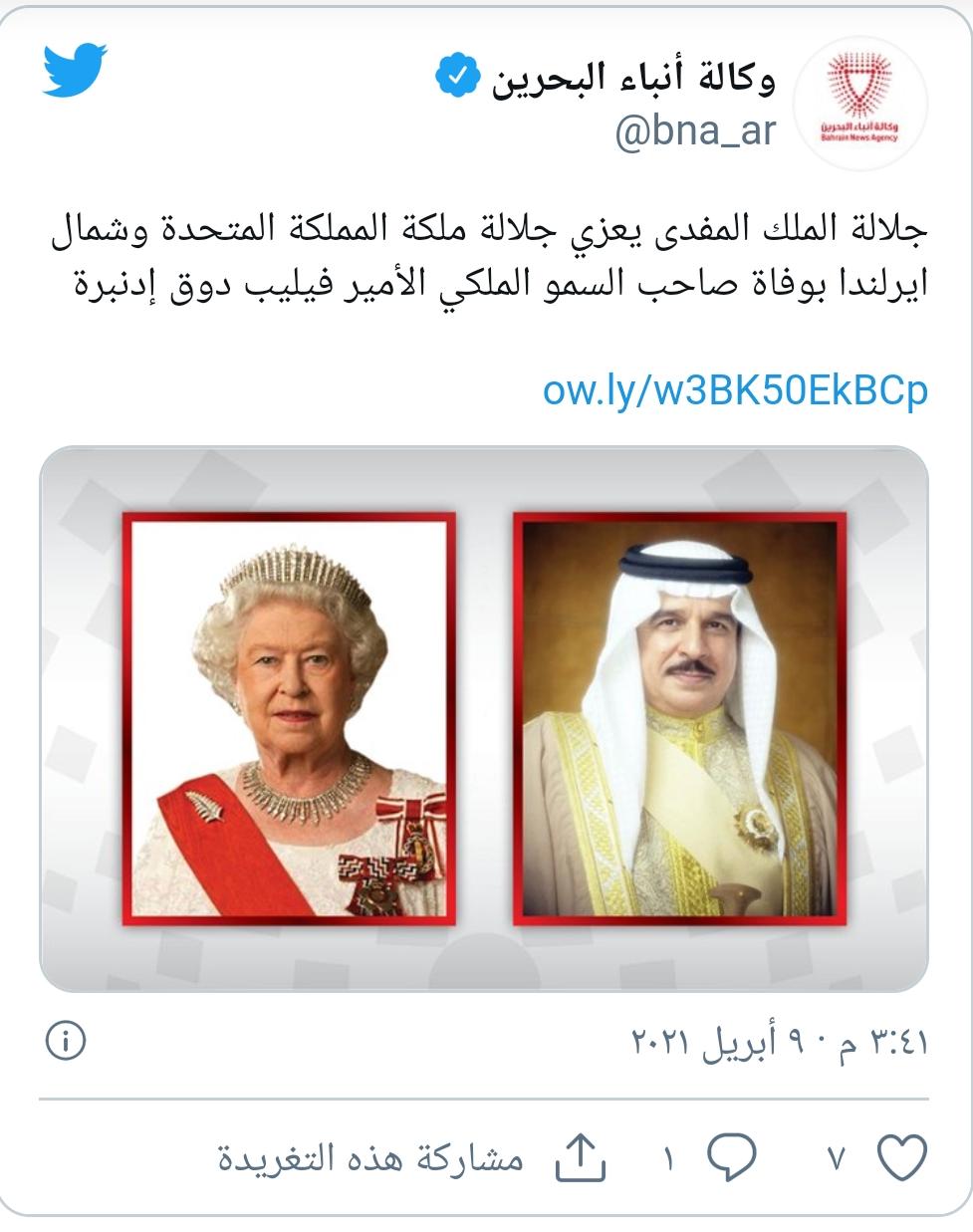وبعث الملك حمد بن عيسى آل خليفة عاهل البحرين برقية تعزية ومواساة إلى الملكة إليزابيث الثانية بوفاة قرينها الأمير فيليب دوق إدنبرة، معربا عن "خالص تعازيه وصادق مواساته لصاحبة الجلالة وحكومة وشعب بريطانيا الصديق، راجيا الرحمة للفقيد وللأسرة المالكة الكريمة جميل الصبر وحسن العزاء".