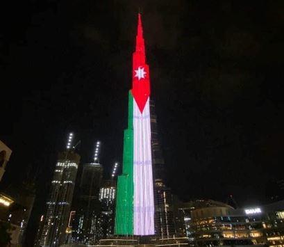 أضاءت دولة الإمارات، مساء السبت، برج خليفة في إمارة دبي، بالعلم الأردني.