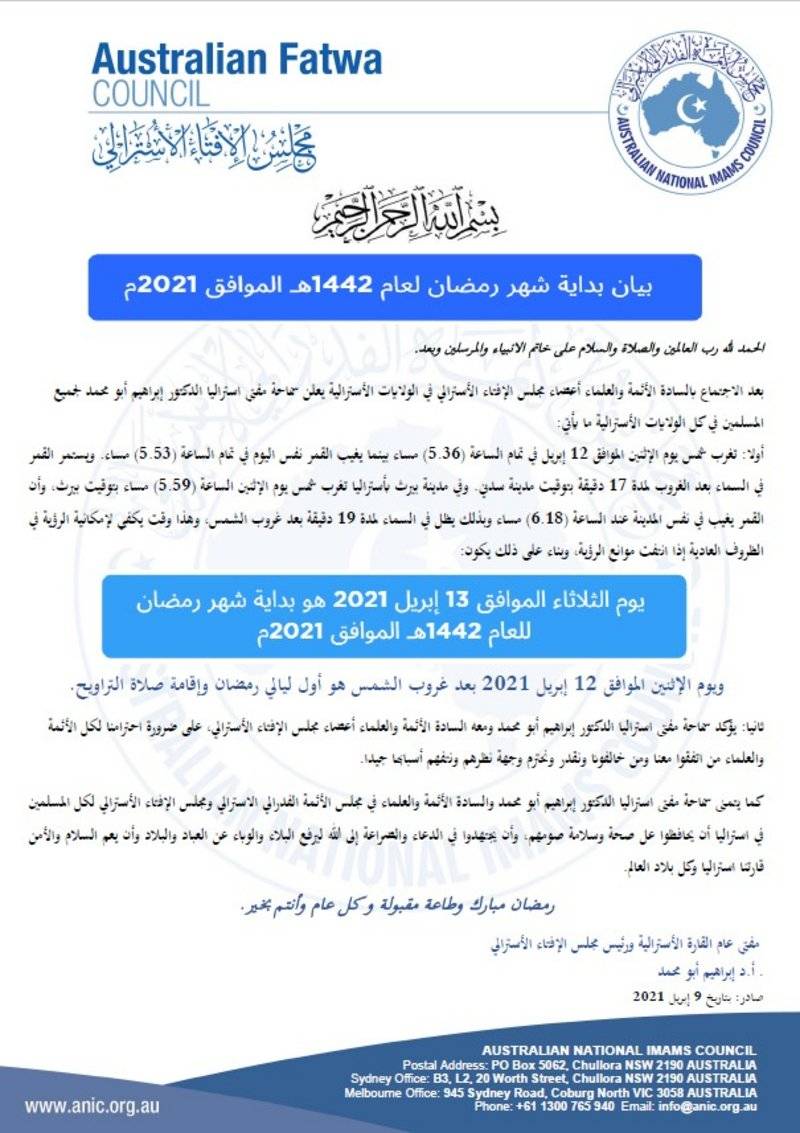 أعلن مجلس أئمة مسلمي أستراليا أن يوم غدٍ الإثنين هو المُكمل لشهر شعبان، ويوم الثلاثاء هو أول أيام شهر رمضان الموافق 13 أبريل من عام 2021.