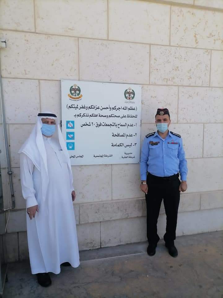 وفي مديرية شرطة العقبة قامت الشرطة المجتمعية وبالتعاون مع أعضاء المجلس المحلي بتعليق يافطات في مستشفى الأمير هاشم ومقبرة العقبة، تتضمن تقديم التعزية لذوي المتوفين بالإضافة إلى نصائح توعوية حول فيروس كورونا.