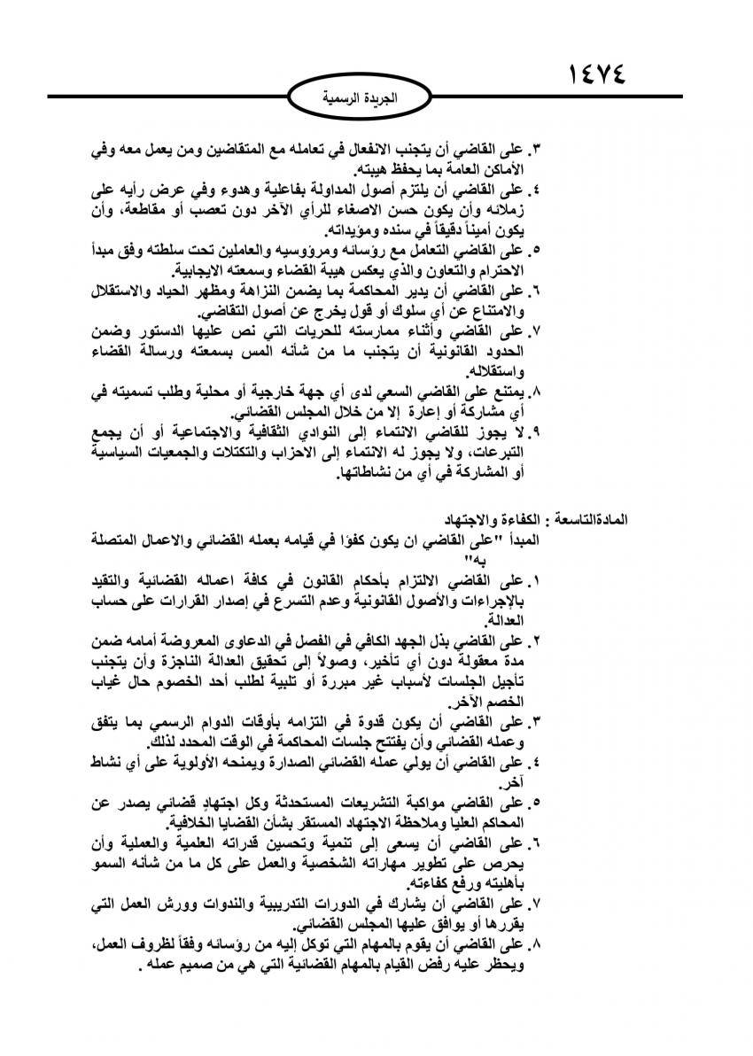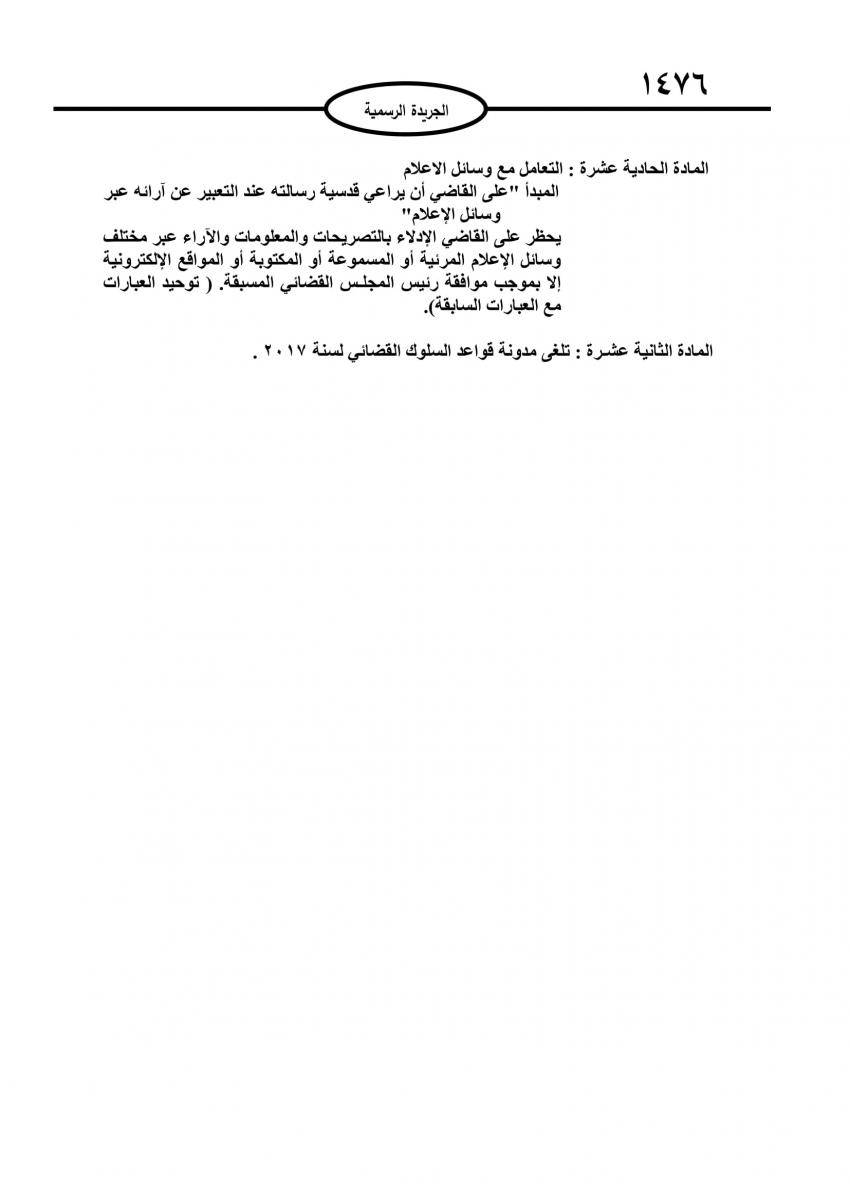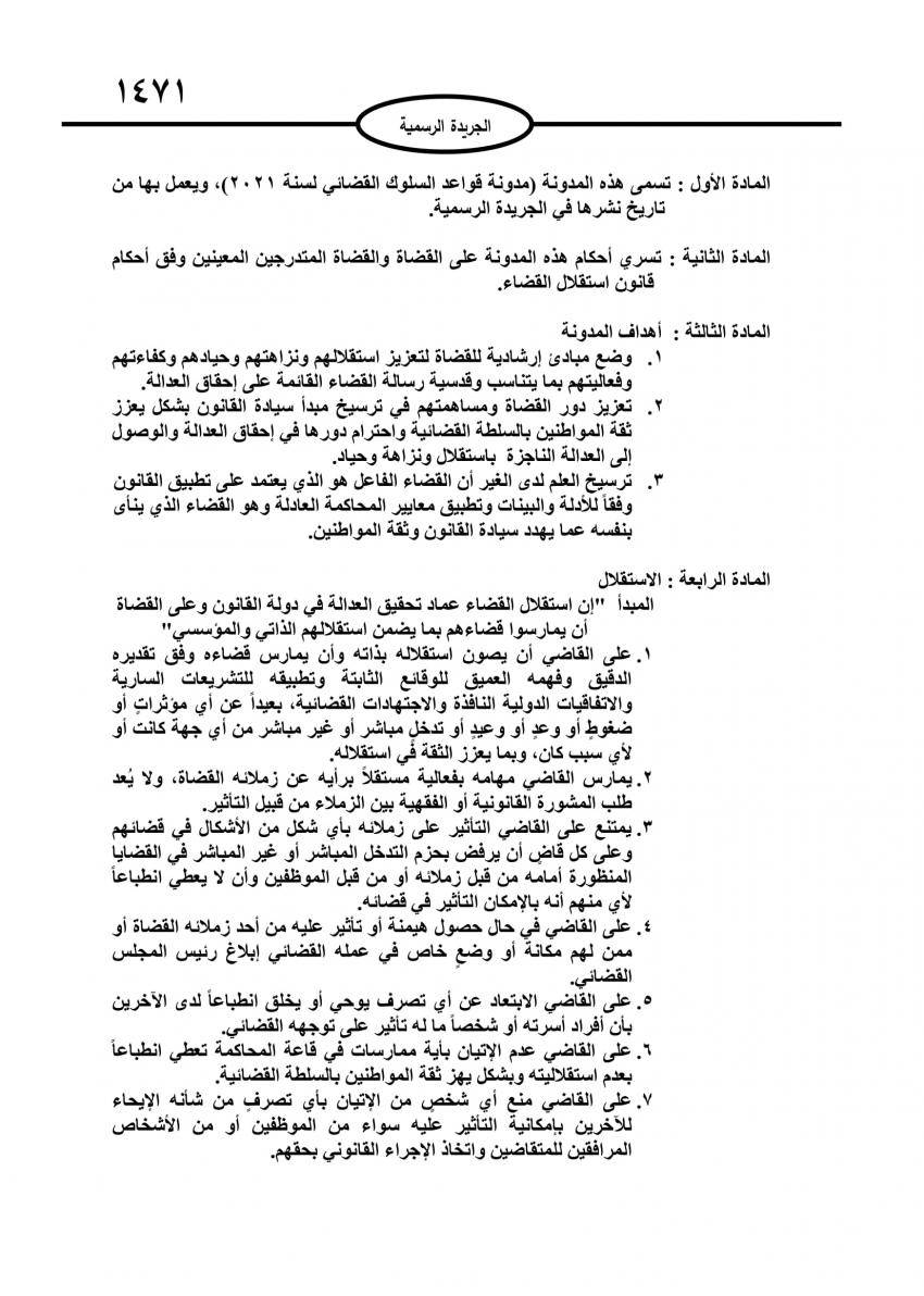 صدر في عدد الجريدة الرسمية اليوم الخميس مدونة قواعد السلوك القضائي لسنة 2021.